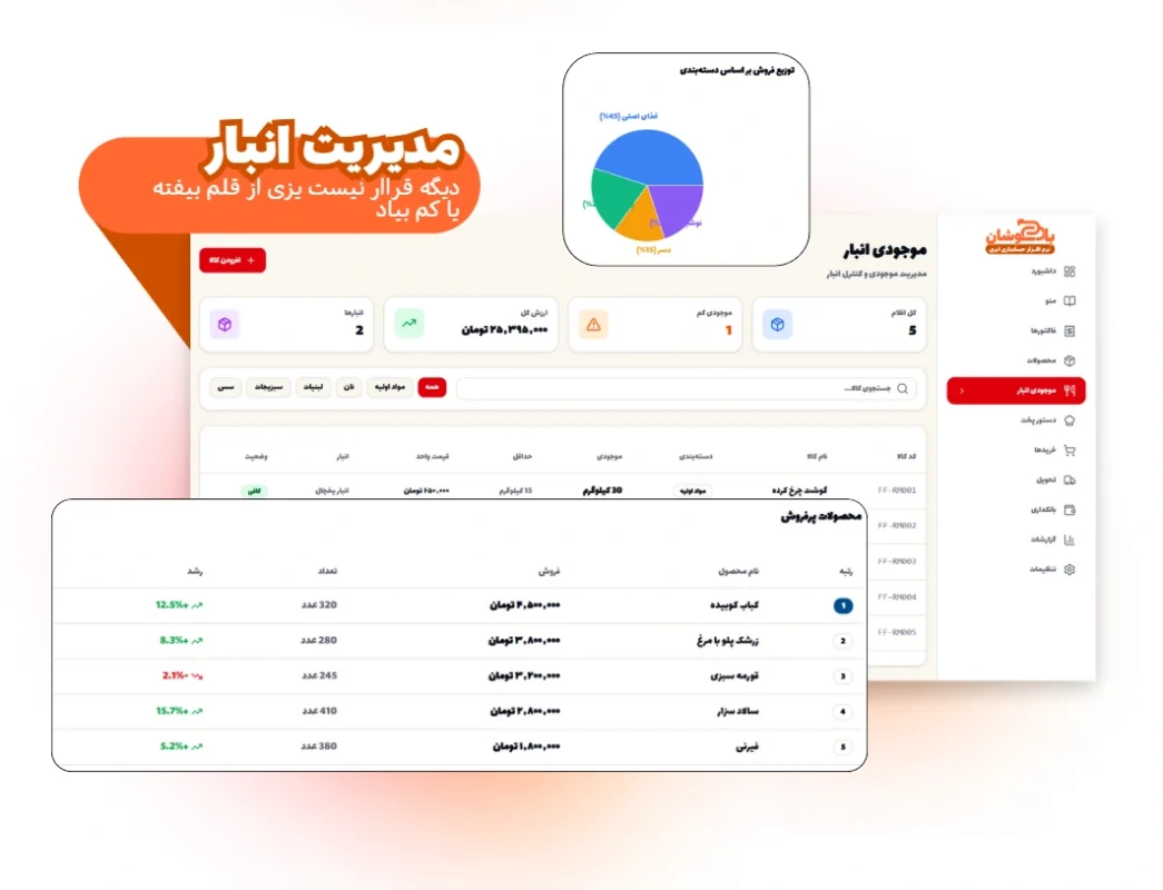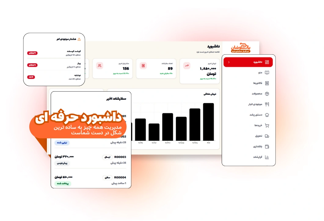 مدیریت انبار مواد اولیه همیشه چالشی بزرگ بود. اما در بهوشان وقتی یکی از آیتمها کم شود، هشدار میدهد و من میتوانم سریع سفارش بدهم. علاوه بر آن، داشبورد هوشمند شرایط درآمد و هزینه هر بخش مجموعه غذاییام را در یک نگاه نشان میدهد.